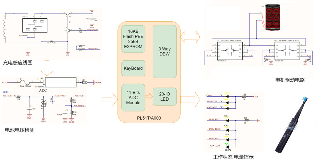 本方案采用PL51T/A003芯片,芯片内集成16KB-flash,256Byte真EEPROM,11Bit-ADC, 3路DBW等丰富资源; 方案集成无线线圈感应式充电,过冲保护,过放保护,LED电量指示功能; PWM驱动集成DBW死区保护功能,有效保护驱动MOS;