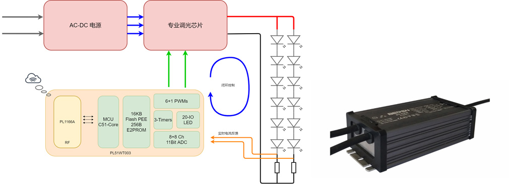 本方案采用PL51WT003芯片,芯片内集成16KB-flash,256Byte真EEPROM,8+8路11Bit-ADC, 6路PWM等丰富资源,同时片上集成了PL1166A射频芯片,实现无线遥控等功能; 方案实时采集各路灯珠的电流,做到灯珠电流闭环精准控制, 能够有效避免灯珠长时间使用造成的亮度降低问题;